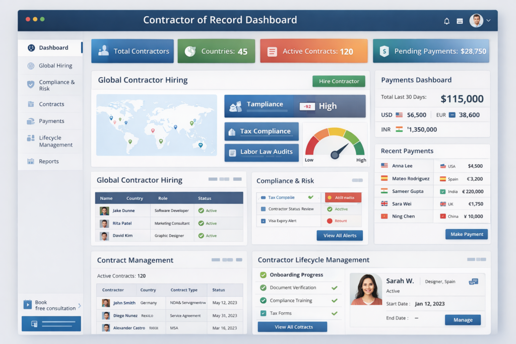 A Contractor of Record (COR) is a third-party service provider that legally engages independent contractors on your behalf. It ensures that contractor relationships are compliant with local labor laws, reducing the risk of misclassification and penalties.